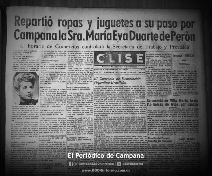 Foto: El paso de Eva Perón por Campana como titular del diario Clisé del 12 de diciembre de 1947